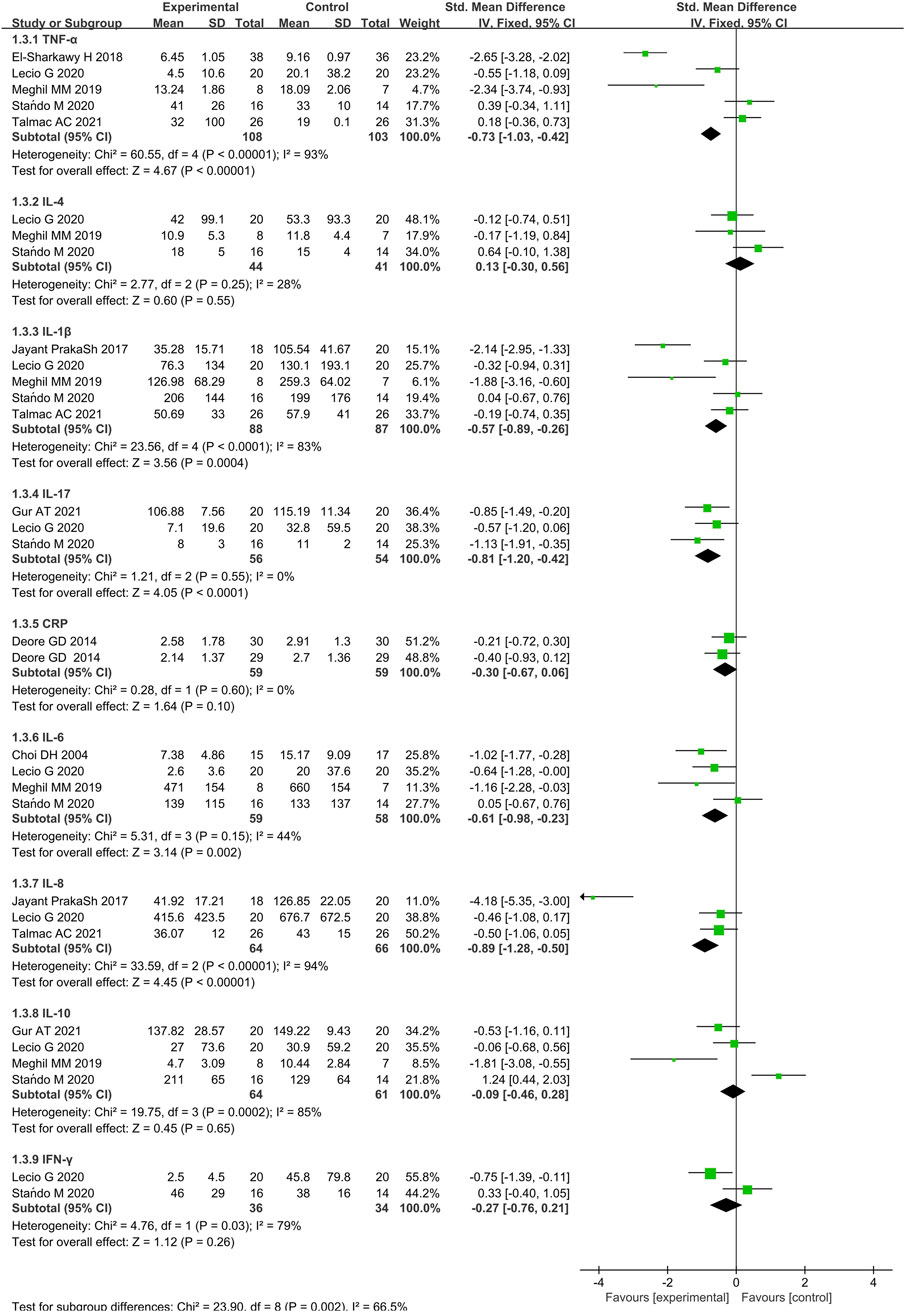 Forest plot showing a meta-analysis of cytokines across various studies, comparing experimental and control groups. The plot includes subgroups for TNF-α, IL-4, IL-1β, IL-17, CRP, IL-6, IL-8, IL-10, and IFN-γ. Each study is represented with a standardized mean difference, confidence intervals, and weights. Diamonds indicate summary effects for subgroups, showcasing overall trends and heterogeneity measures.