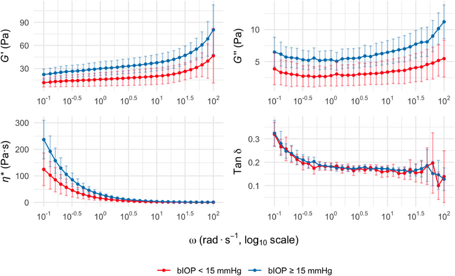 Figure 1. Viscoelastic parameters of corneal stromal lenticules at different oscillatory frequencies. G′, G″, η*, and tan δ are plotted versus ω. Data are presented as mean with 95% confidence intervals for two groups stratified by bIOP: bIOP <15 mmHg (red curves) and bIOP ≥15 mmHg (blue curves). Data are presented as mean values with 95% confidence intervals. Abbreviation: G′, Storage modulus; G″, loss modulus; η*, complex viscosity; tan δ, loss tangent; ω, angular frequency; bIOP, biomechanically corrected intraocular pressure.