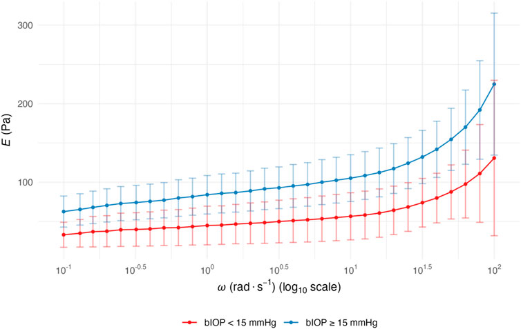 Figure 2. ω-dependent E of corneal stromal lenticules stratified by bIOP. Data are presented as mean with 95% confidence intervals for two groups stratified by bIOP: bIOP <15 mmHg (red curves) and bIOP ≥15 mmHg (blue curves). Data are presented as mean values with 95% confidence intervals. Abbreviation: ω, angular frequency; E, elastic modulus; bIOP, biomechanically corrected intraocular pressure.