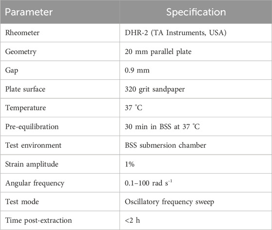 Ex vivo rheological properties of the lenticules were measured on a DHR-2 rheometer (TA Instruments, USA) using a 20 mm parallel-plate geometry with a 0.9 mm gap. To prevent slippage and ensure no-slip boundary conditions, 320 grit sandpaper was glued to both loading platens (Hatami-Marbini, 2014). Prior to testing, specimens were equilibrated in BSS solution at 37 °C for 30 min. The submersion chamber of the rheometer was filled with BSS solution to maintain tissue hydration throughout measurements. Oscillatory frequency sweeps were performed at 37 °C with 1% strain and an angular frequency (ω) of 0.1–100 rad s-1. The G′, G″, η*, and tan δ were calculated to characterize viscoelastic behavior. All biomechanical tests were completed within 2 hours of extraction to minimize tissue degradation. The detailed rheological testing parameters are summarized in Table 1.