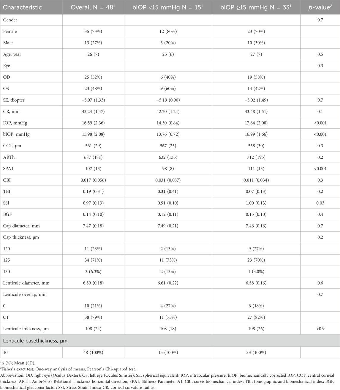 A total of 48 corneal stromal lenticule specimens from 26 young myopic adults were included in the analysis. Among them, 22 subjects contributed bilateral data and four contributed unilateral data. The lenticules were stratified into two groups according to bIOP: bIOP <15 mmHg (N = 15) and bIOP ≥15 mmHg (N = 33). The primary analysis treated each lenticule as an independent observation. A sensitivity analysis using only one randomly selected eye per subject (N = 26) yielded consistent results, suggesting that inter-eye correlation did not substantially affect the conclusions. There were no statistically significant differences in baseline characteristics such as age, gender distribution, pre-operative central corneal thickness (CCT), BGF, and parameters related to the cap, stromal lenticule, and remaining stroma bed thickness from the SMILE procedure between the two groups (all p > 0.05; Table 2).