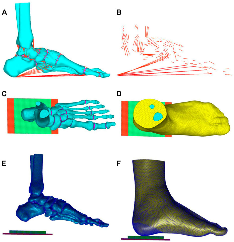 Figure 2. (A,B) Ligaments and tendons of the foot (red lines), connecting nodes on the bone grid surface and attachment points of ligaments and tendons, corresponding to MRI data to form 1D spring units as the tension elements of ligaments and tendons. Top view (C,D) and side view (E,F) of the three-dimensional finite element model: the model comprises bones (cyan part), skin and soft tissue (yellow part), tendons and ligaments (red lines), ground support layer (red block), and heel cushion pad (green block).