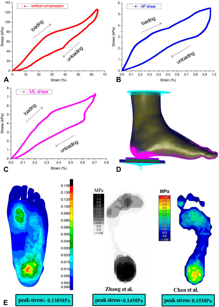 Figure 3. (A–C) Stress–strain constitutive relationship curve of the three-dimensional material properties of plantar soft tissue under the heel, including loading and unloading curves. (D) Boundary condition settings of the finite-element model. (E) Validation of the accuracy of the finite-element model, showing similar trends in plantar pressure distribution as two previous studies, indicating that the model is accurate and reliable. AP, anterior–posterior; ML, mediolateral.