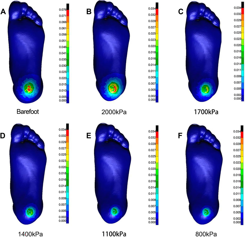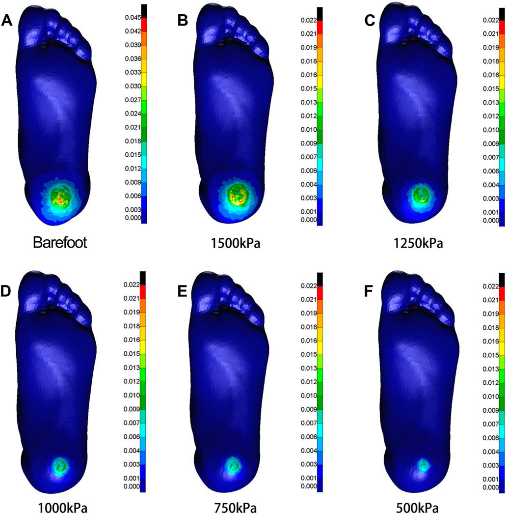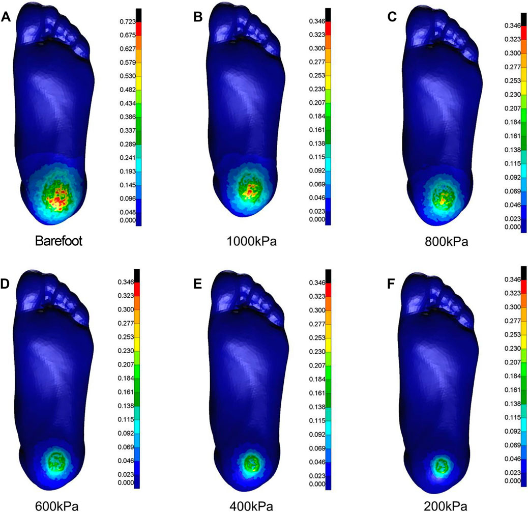 Figure 4. Cloud maps of Mises stress under vertical compression towards different heel cushion elastic moduli (B: 1000kPa; C: 800kPa; D: 600kPa; E: 400kPa; F: 200kPa) compared to barefoot state (A). The color bar unit is MPa.