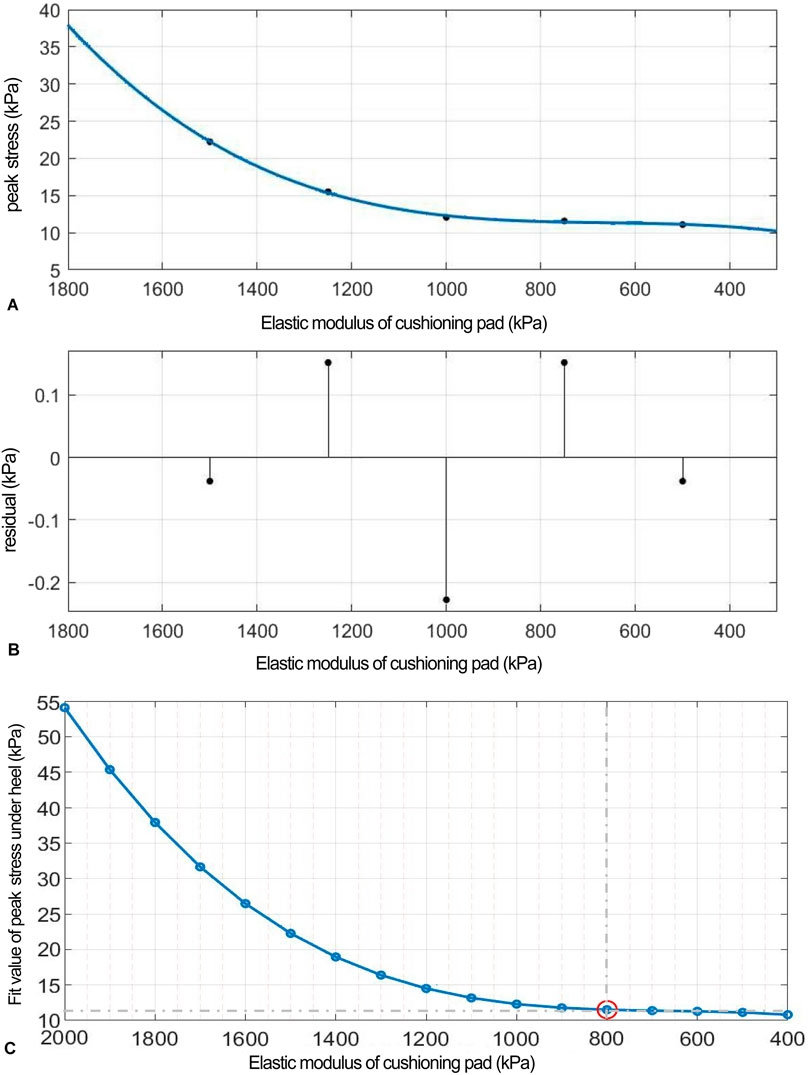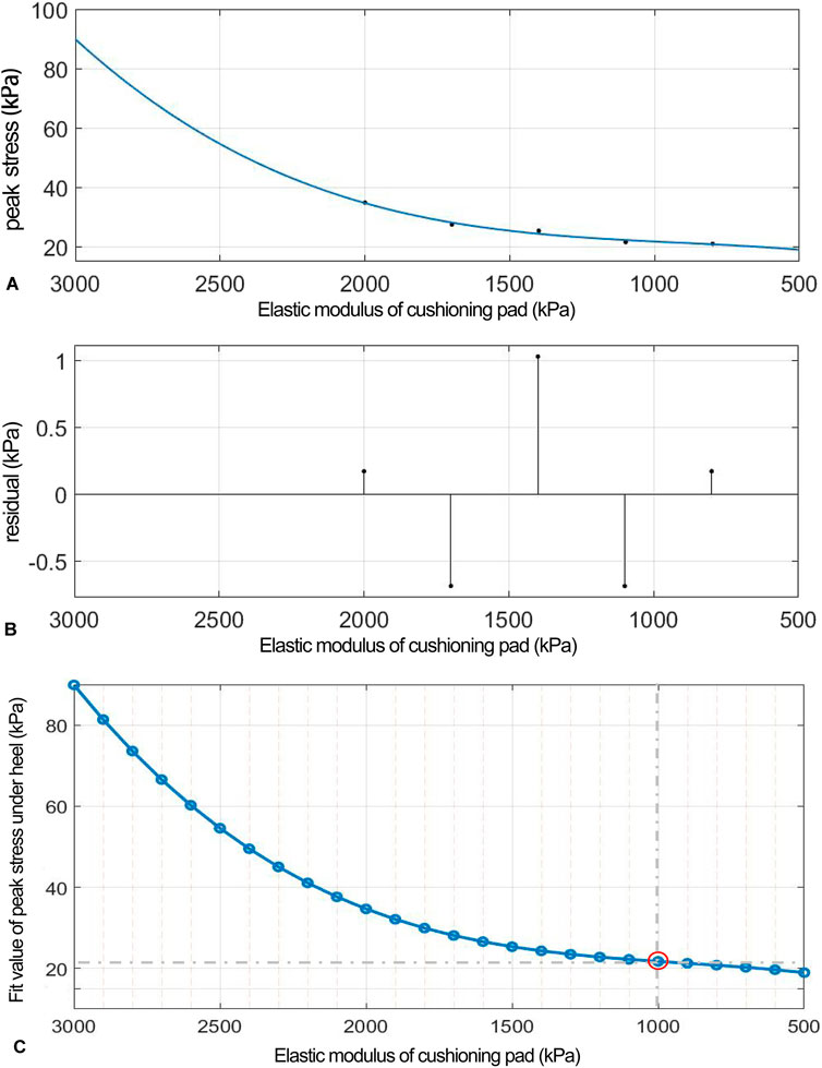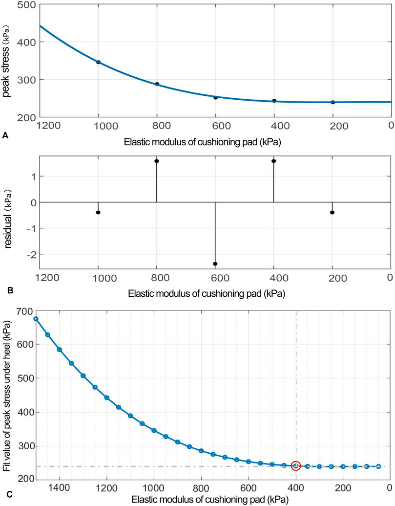 Figure 5. (A) Polynomial fitting curve between the peak compressive stress and elastic modulus of the heel cushion pad. (B) Residual plot. (C) Using the fit equation, the change curve of predicted peak compressive stress on the plantar surface with changes in the vertical elastic modulus of the heel cushion pad within the range of 50–1,500 kPa. When the elastic modulus decreases to approximately 400 kPa, the peak stress of the plantar surface gradually reaches a plateau.