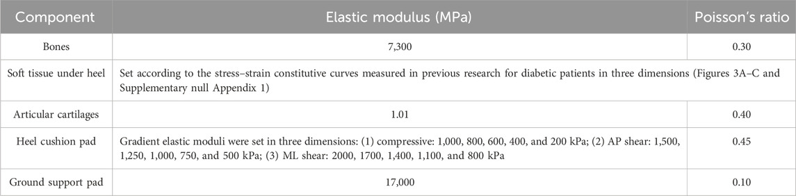 The material parameter settings for the FE model were based on previously published literature (Jafarzadeh et al., 2021; Chen et al., 2015; Shaulian et al., 2021; Tang et al., 2019), assuming that the bones, articular cartilages, ground support plate, and heel cushion pad were isotropic, homogeneous, and continuous linear elastic materials, while the soft tissue under heel was a hyperelastic material. The material parameters for each non-tendon/ligament component of the FE model are detailed in Table 1. The material properties of the plantar soft tissue were set according to the stress–strain constitutive curves measured in three dimensions for diabetic patients in previous research (as shown in Figures 3A–C and Supplementary null Appendix 1). The material properties of heel cushion pads were preset with a series of gradient elastic moduli in three dimensions. The ligaments and tendons were modeled as 1D linear spring elements, with their elastic moduli and spring equivalent stiffnesses detailed in Supplementary Table S1. The bonded contact was set between the bones and articular cartilage, between the soft tissue and articular cartilage/bones, and between the heel cushion pad and ground support plate. The frictional contact with a coefficient of 0.5 was set between the heel cushion pad and the plantar soft tissue. The upper tibial and fibular cross-section was fixed, restricting six degrees of freedom to immobilize the proximal end of the model. The boundary constraints of the FE model are illustrated in Figure 3D.