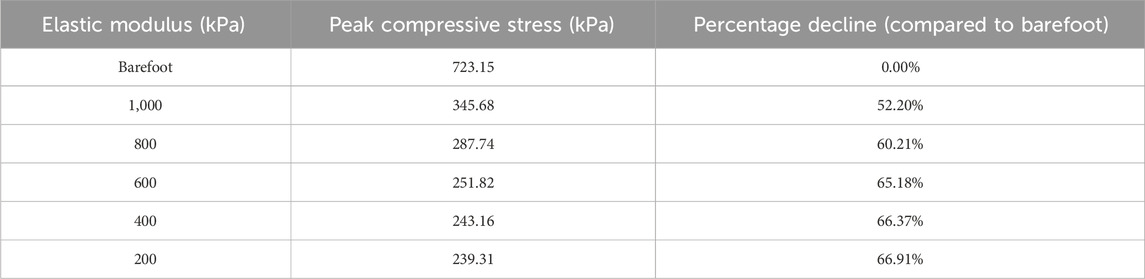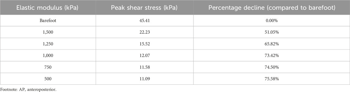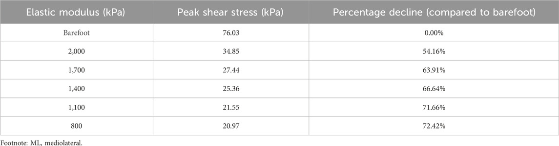 Results: Reducing the elastic moduli of heel cushioning pads led to decreased peak stresses across all directions. Notably, the peak compressive stress decreased by 52.20%–66.91%, while AP and ML shear stresses decreased by 51.05%–75.58% and 54.16%–72.42%, respectively. Polynomial analyses revealed optimal stress reductions within specific elastic modulus ranges (400, 800, and 1,000 kPa in compressive, AP-shear, and ML-shear dimensions, respectively), indicating diminishing benefits beyond these points.