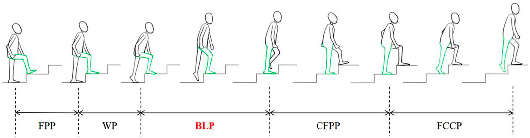Figure 1. Complete gait cycle scheme during stair climbing includes a support phase [Weight-bearing Phase (WP), Body Lifting Phase (BLP), and Continuous Forward Propulsion Phase (CFPP)] and a swing phase. [Foot Contour Clearance Phase (FCCP) and Foot Placement Phase (FPP)] (Shumway-Cook and Woollacott, 2014).