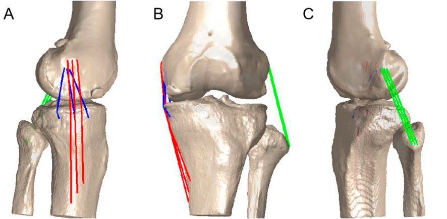 Three 3D renderings of a human knee joint labeled A, B, and C. Each panel shows ligaments represented by colored lines superimposed on the bones. Panel A displays red and blue lines, panel B shows red and blue lines from a different angle, and panel C highlights green lines on the side view. The renderings provide various views of ligament orientations relative to the knee joint.