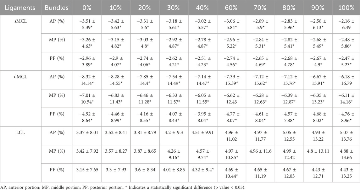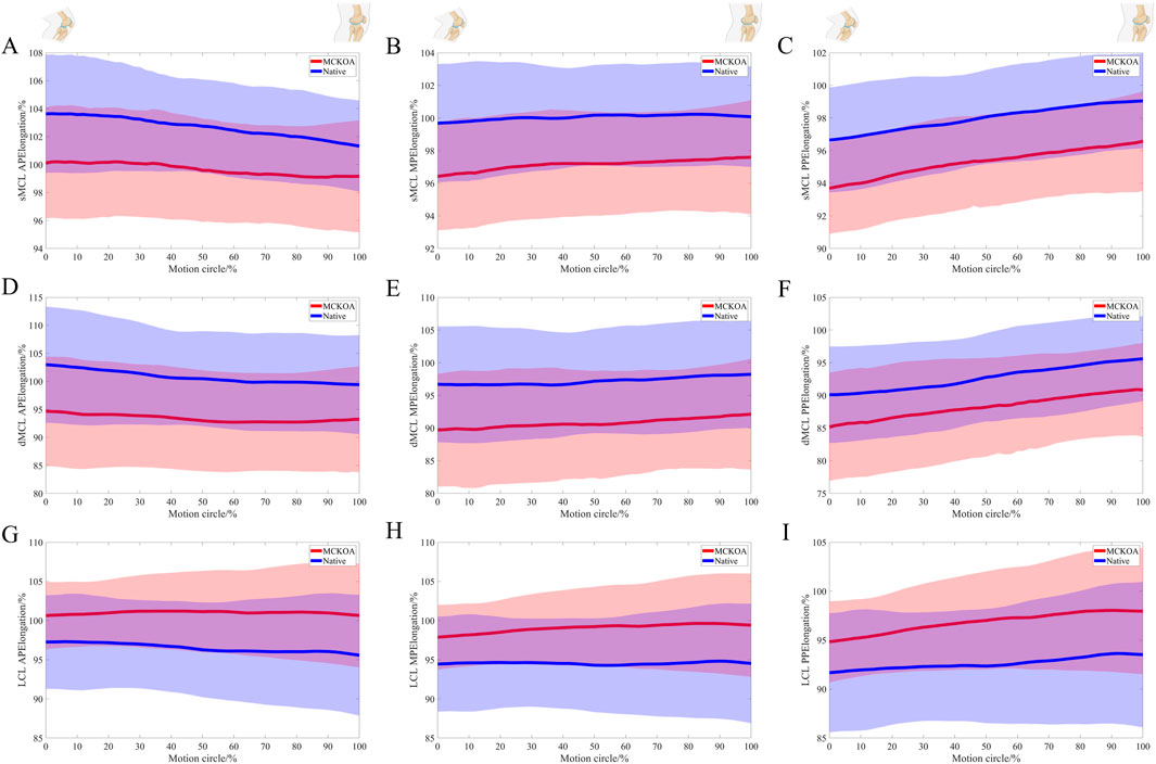 On the MCKOA side, all three collateral ligaments underwent a process of shortening first. Only the anterior and medial bundles of the sMCL lengthened slightly at the 30% of the motion cycle. Afterwards, all the ligament bundles continued to shorten until lengthening at 70% of the motion cycle, followed by a mild shortening process until the last lengthening stage at the end of extension. During extension, the amplitude of the fluctuations in the length changes in MCKOA collateral ligaments is more pronounced compared to the native side (Table 2).