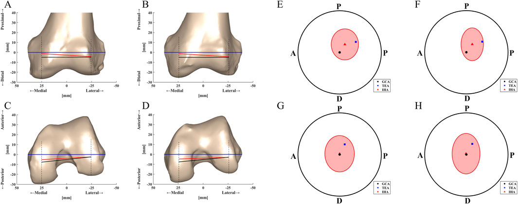 Figure 4. TEA, GCA and IHA locations displayed on the different planes of two-sided knees with their standard deviation projections depicted on different two-sided GCA planes: (A) MCKOA frontal section plane, (B) Native frontal section plane, (C) MCKOA transverse section plane, (D) Native transverse section plane, (E) MCKOA side knee medial condyle GCA plane, (G) MCKOA side knee lateral condyle GCA plane, (F) Native side knee medial condyle GCA plane and (H) Native side knee lateral condyle GCA plane. A–P: Anterior-Posterior; P–D: Proximal-Distal.