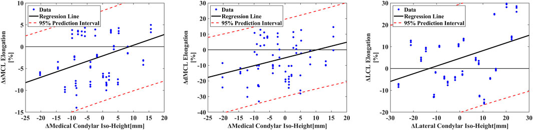 Three scatter plots show the relationship between condylar iso-height changes and ligament elongation percentages. Each plot includes data points, a regression line, and a 95% prediction interval. The first plot displays data for ΔsMCL, the second for ΔdMCL, and the third for ΔLCL, all against ΔMedical or ΔLateral Condylar Iso-Height in millimeters.