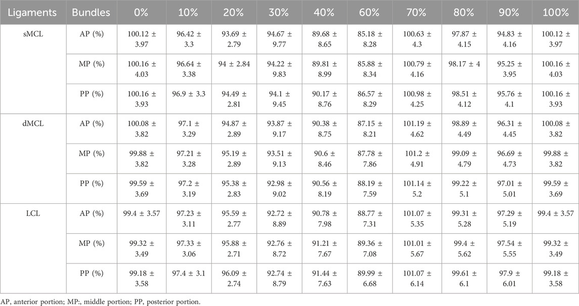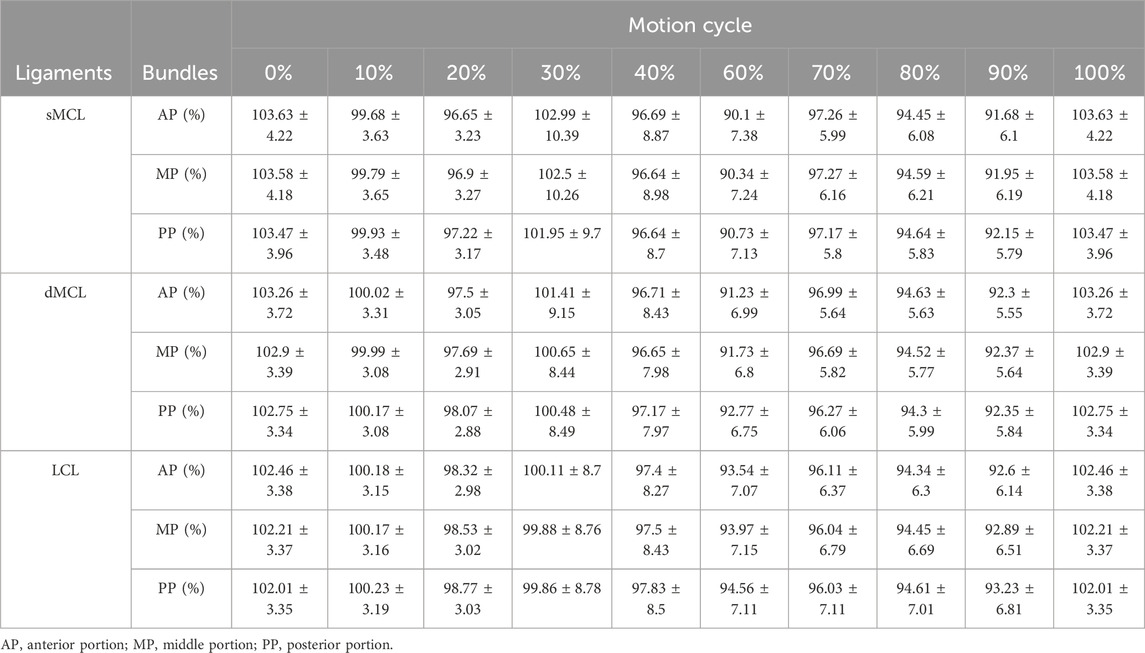 During the extension of the native knee, all the lengths of collateral ligament bundles shortened at the first 20% of the motion cycle and then lengthened at 30% of the motion cycle. After that, each ligament underwent shortening again until another lengthening process at 70% of the motion cycle, followed by a mild-shortening process until the last lengthening process at the end of extension (100% of the motion cycle) (Table 1).