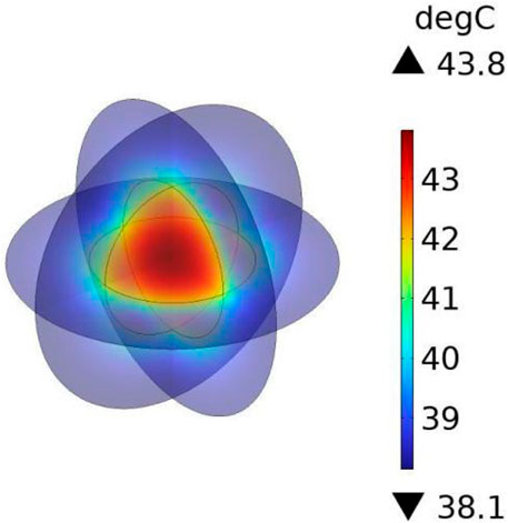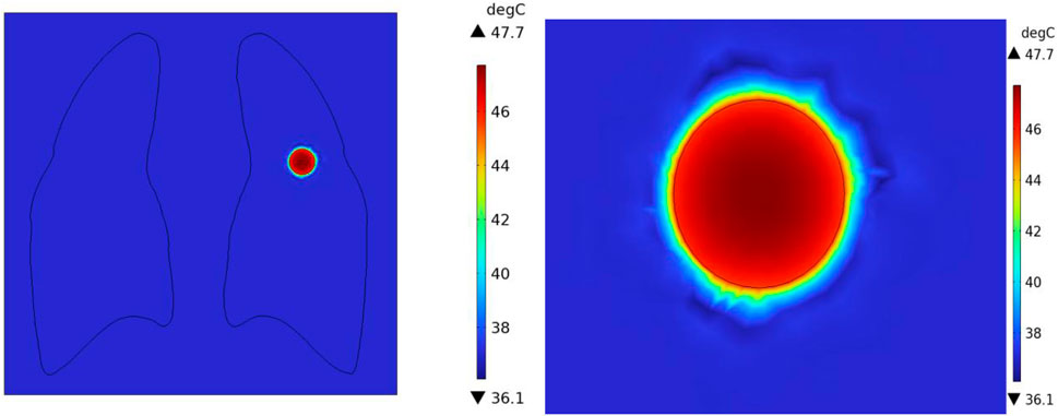 By coupling the flow field distribution solved in Section 4.3 for blood flow in the pulmonary vessels, we continue to input the magnetic fluid heating power P0 = 664,360 W/m3 into the lung tumor model with blood vessel distribution. The temperature field distribution in the model is then solved in COMSOL.