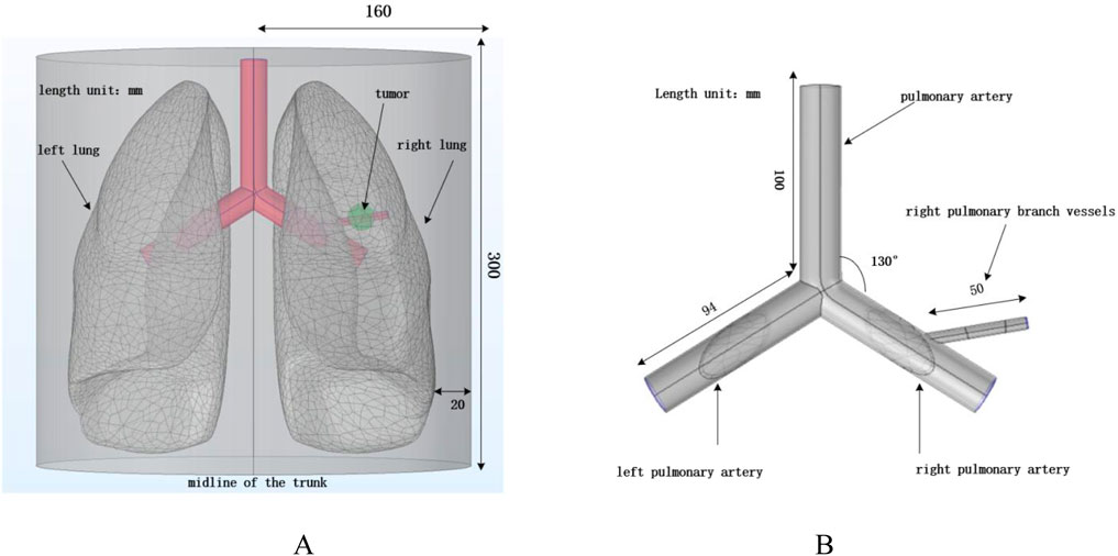 Figure 3. Human lung and vascular model. (A) Human thoracic and lung model; (B) Vascular structure diagram.