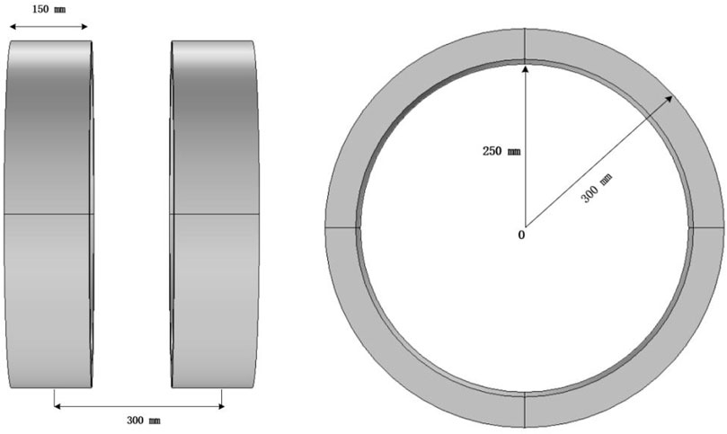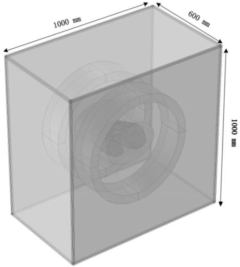 The heating power of the magnetic fluid is influenced by the strength and frequency of the applied magnetic field. The frequencies typically used for hyperthermia range from 10 kHz to 500 kHz. Low frequencies (below 50 kHz) may stimulate the neuromuscular system, while high frequencies may induce strong eddy currents, potentially causing inadvertent damage to healthy tissues (Bohnert et al., 2009). Considering the penetration depth, safety, and therapeutic effects, a frequency of 100 kHz for the alternating magnetic field was selected. The coil size is based on the “Chinese Adult Body Size” (Standards Administration of the People’s Republic of China, 1988), where 99% of men have a shoulder width less than 486 mm, and women have a shoulder width less than 458 mm. To ensure the human body is positioned at the center of the magnetic field and to accommodate the space requirements for the device housing and cooling structure, the coil diameter is set to 600 mm.