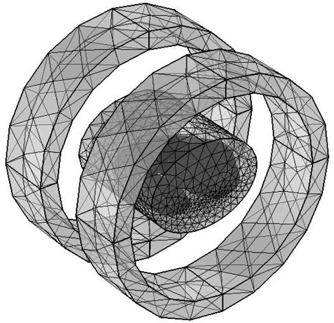 The three-dimensional coil model constructed in this study is shown in Figure 5. Both coils have a radius of 300 mm, a length of 150 mm, and a thickness of 50 mm, with a center-to-center distance of 300 mm. The excitation current for the coils is set to I = 10 A, with a coil turn number N = 380 and a frequency of 100 kHz. Copper is chosen as the coil material, with a conductivity of σ = 5.998 × 107 S/m, a relative permeability of 1, and a wire cross-sectional area of 2 mm2. The fixed bottom structure and power supply interface are omitted in the model.