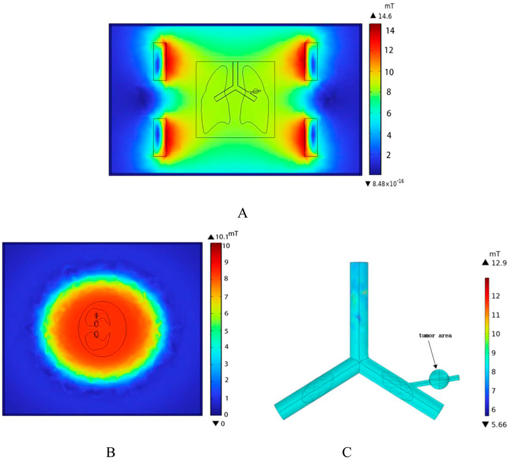 Figure 8. Spatial magnetic field distribution (A) x-y plane magnetic field distribution (B) z-x plane magnetic field distribution (C) Magnetic field distribution in the vessel wall and tumor region.