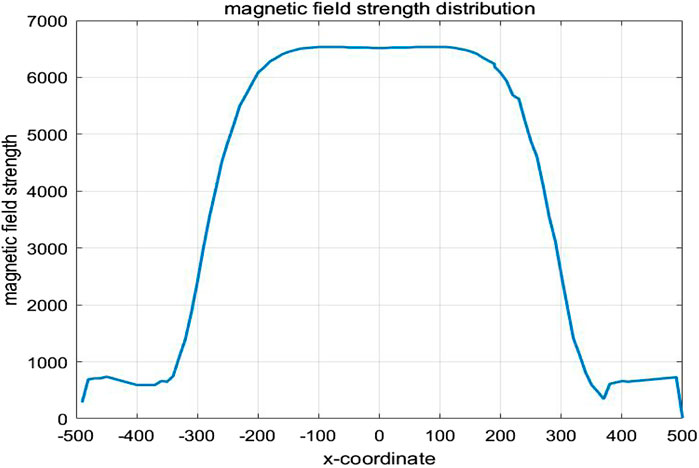 The one-dimensional magnetic field strength distribution at different positions along the x-axis in the middle of the model is shown in Figure 9. At x = −140 mm,the magnetic field strength is equal to that at x = 140 mm, approximately 6682 A/m. At x = 0 mm,the magnetic field strength is measured as 6670 A/m. It can be seen that within the range of x = −140 mm to x = 140 mm, the amplitude change in magnetic field strength is about 0.18%, tending to stabilize.