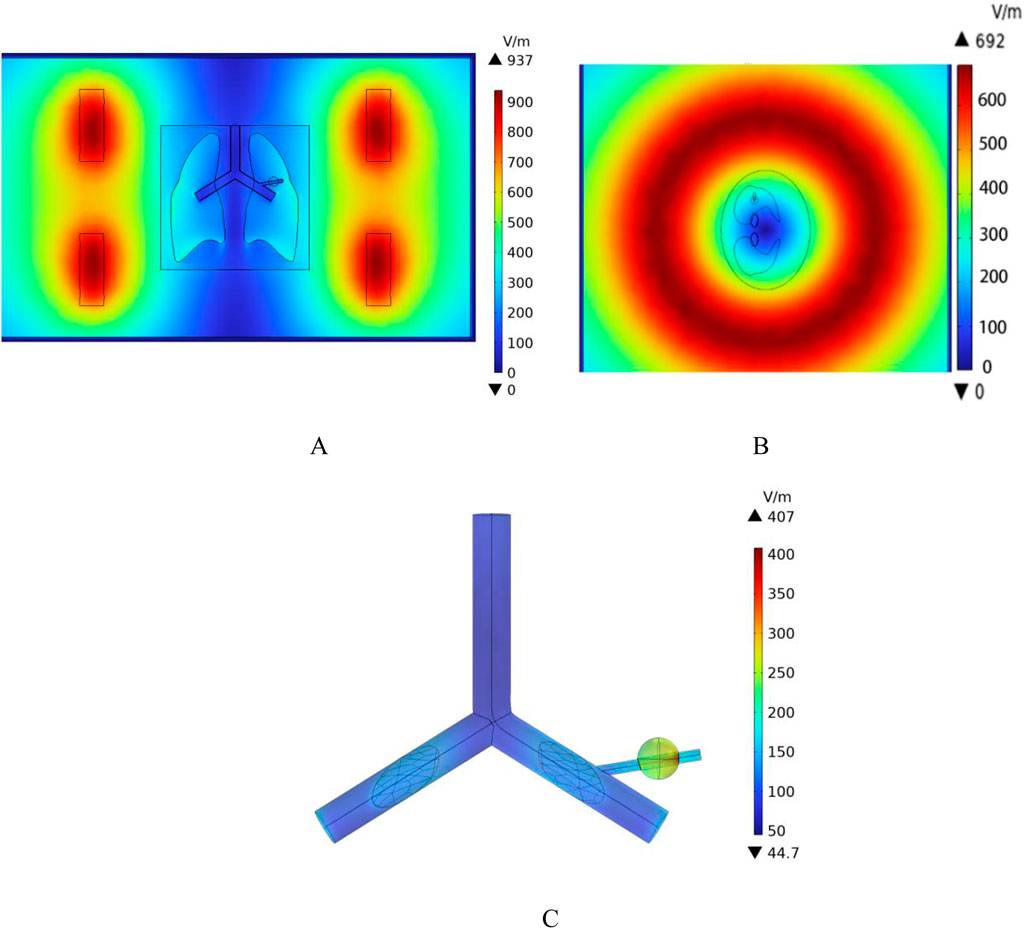 Figure 10. Spatial electric field distribution. (A) x-y Plane electric field distribution (B) z-x Plane electric field distribution (C) Blood vessel wall and tumor region electric field distribution.