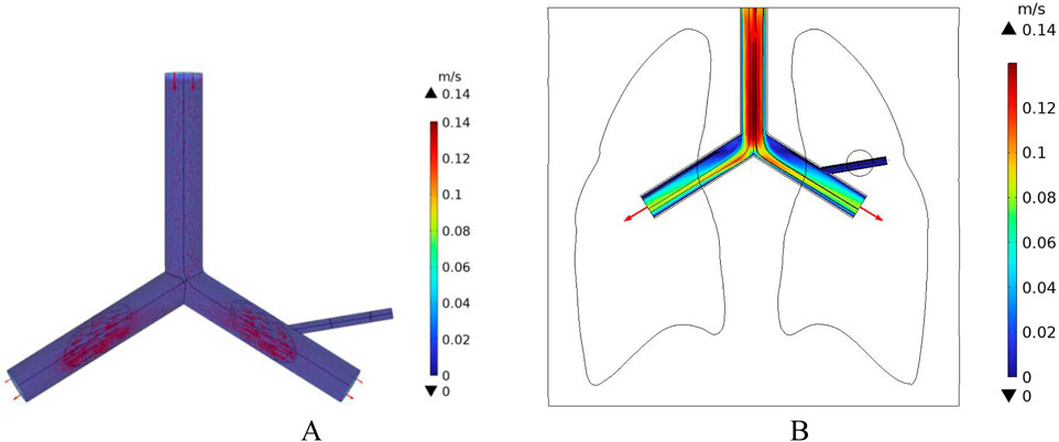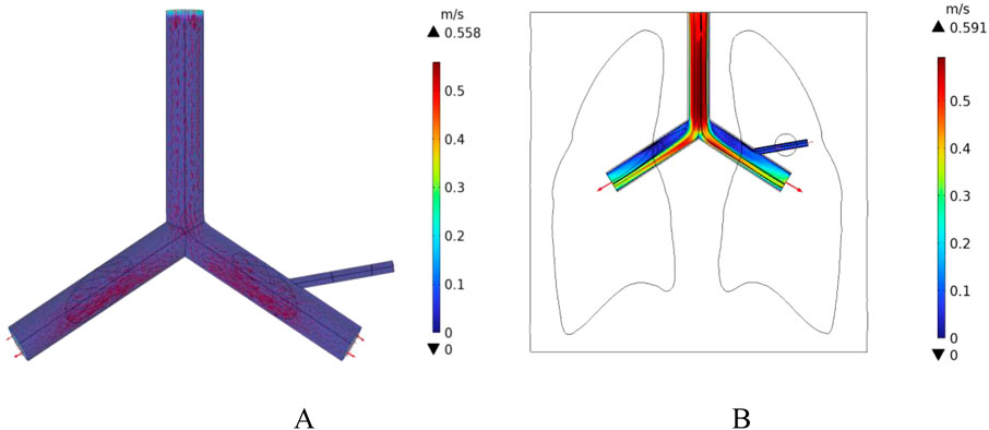 In this study, a cylindrical rigid pipe was used to simulate the blood vessels, and blood flow within the vessels was treated as laminar flow, with blood considered as an incompressible Newtonian fluid. According to the data from reference (Ku, 1997), the dynamic viscosity of arterial blood is μ = 4.2 × 10−3 Pa s, and its density is ρ = 1,050 kg/m3. In COMSOL Multiphysics, a laminar flow physics interface was introduced, with an initial velocity of 0.5 m/s set for the large blood vessels, which is the typical reference velocity for blood flow in the human pulmonary artery (Iasiello et al., 2017). At the same time, the left pulmonary artery, right pulmonary artery, and the distal end of the right pulmonary branch artery were set as outlets, with static environmental pressure applied at these exit conditions to simulate the real blood flow state in human lung blood vessels. The velocity field distribution in the pulmonary blood vessels was calculated, as shown in Figure 11. According to the results in Figure 11, the blood flow velocity at the distal end of the right pulmonary branch artery is about 0.3 m/s, while the blood flow velocity in the right pulmonary branch artery associated with the tumor is 0.12 m/s.