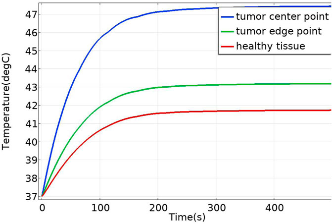 In this study, the magnetic fluid was directly injected into the tumor region, with the volume fraction of the magnetic fluid set to 0.003. It was assumed that the magnetic nanoparticles were uniformly distributed within the tumor. The simulation results indicate that, in the absence of blood flow, the temperature at the tumor center can quickly rise to 47.7 °C within 300 s, and the temperature in the peripheral region stabilizes above 42 °C. All tumor areas meet the temperature threshold for thermal apoptosis of cells, while the temperature of healthy tissue remains below 42 °C, indicating good heating performance.