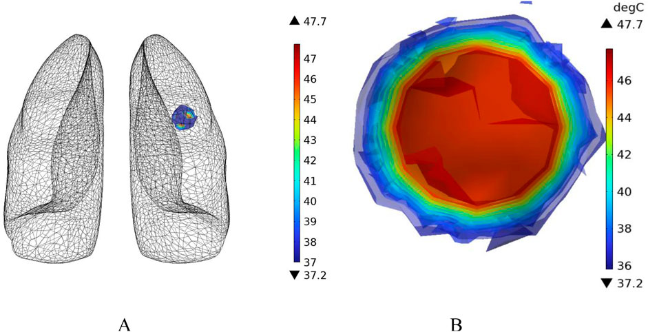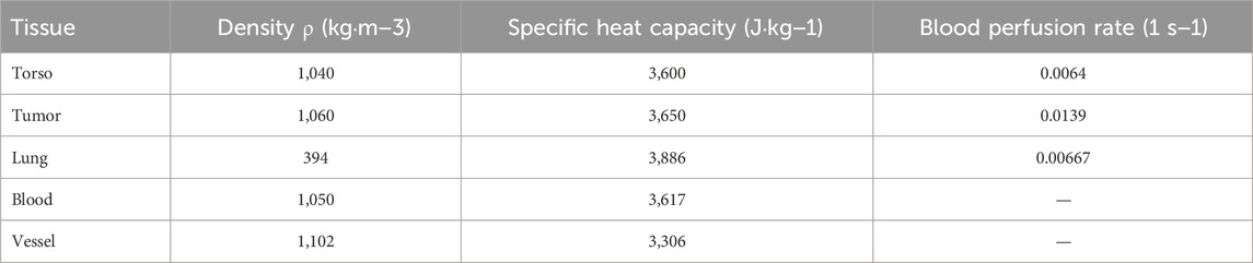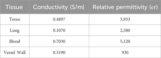 Based on the measured data of different tissues at this frequency (Baumgartner and Hasgall, 2024), the conductivity (σ) and relative permittivity (ϵr) of major tissues, such as human skin, lung tissue, arterial vessel walls, lung tumor tissue, blood, muscle, and bone, were calculated. These parameters were then incorporated into the model for solving the electromagnetic field. Considering the complexity of tissue structures and the necessity of the homogeneity assumption, the average dielectric parameters of skin, muscle, blood, and bone were used as substitutes for the “torso” tissue’s electromagnetic parameters. The dielectric parameters of lung tissue were based on measured data from the human lung in an inflated state, while the parameters for lung tumor tissue were estimated from high-metabolic tumors (such as lung adenocarcinoma). The blood parameters were based on standard laboratory data for arterial whole blood. The resulting dielectric parameters are listed in Table 1.