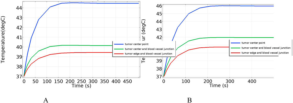 Figure 21. Temperature evolution at characteristic points in the tumor under different blood vessel diameters: (A) Temperature variation at the tumor center (maximum temperature point); (B) Temperature variation at the tumor edge near the vessel interface (minimum temperature point).