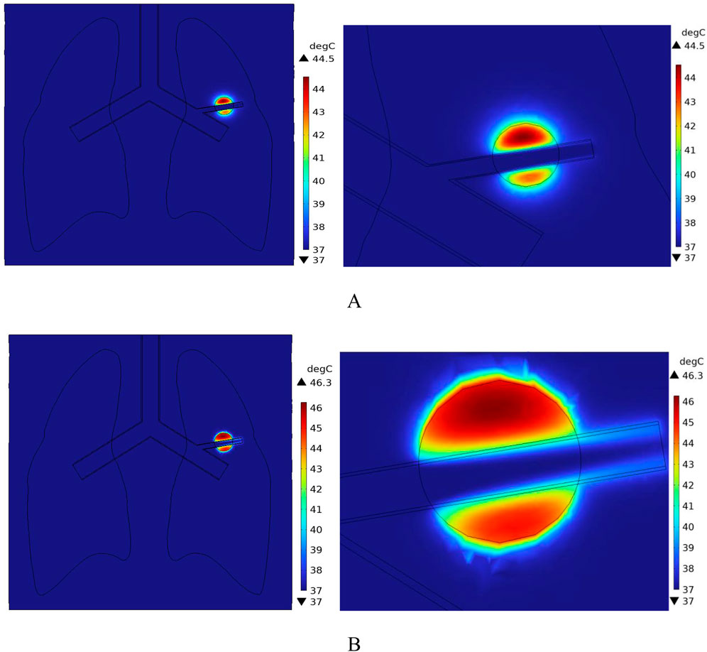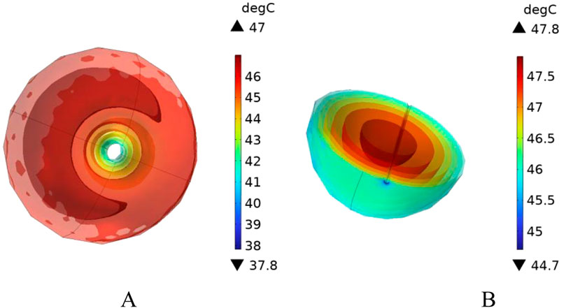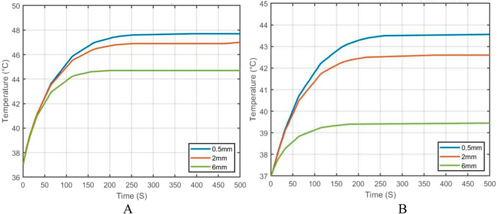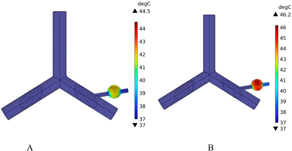 Figure 20. Presents the cross-sectional temperature distribution of the tumor region under different blood vessel diameters: (A) vessel diameter of 2 mm, and (B) vessel diameter of 0.5 mm.