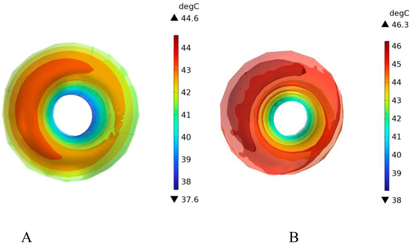 Figure 19. Tumor region profile temperature distribution (A) Tumor region temperature distribution at normal flow velocity (B) Tumor region temperature distribution at low flow velocity.