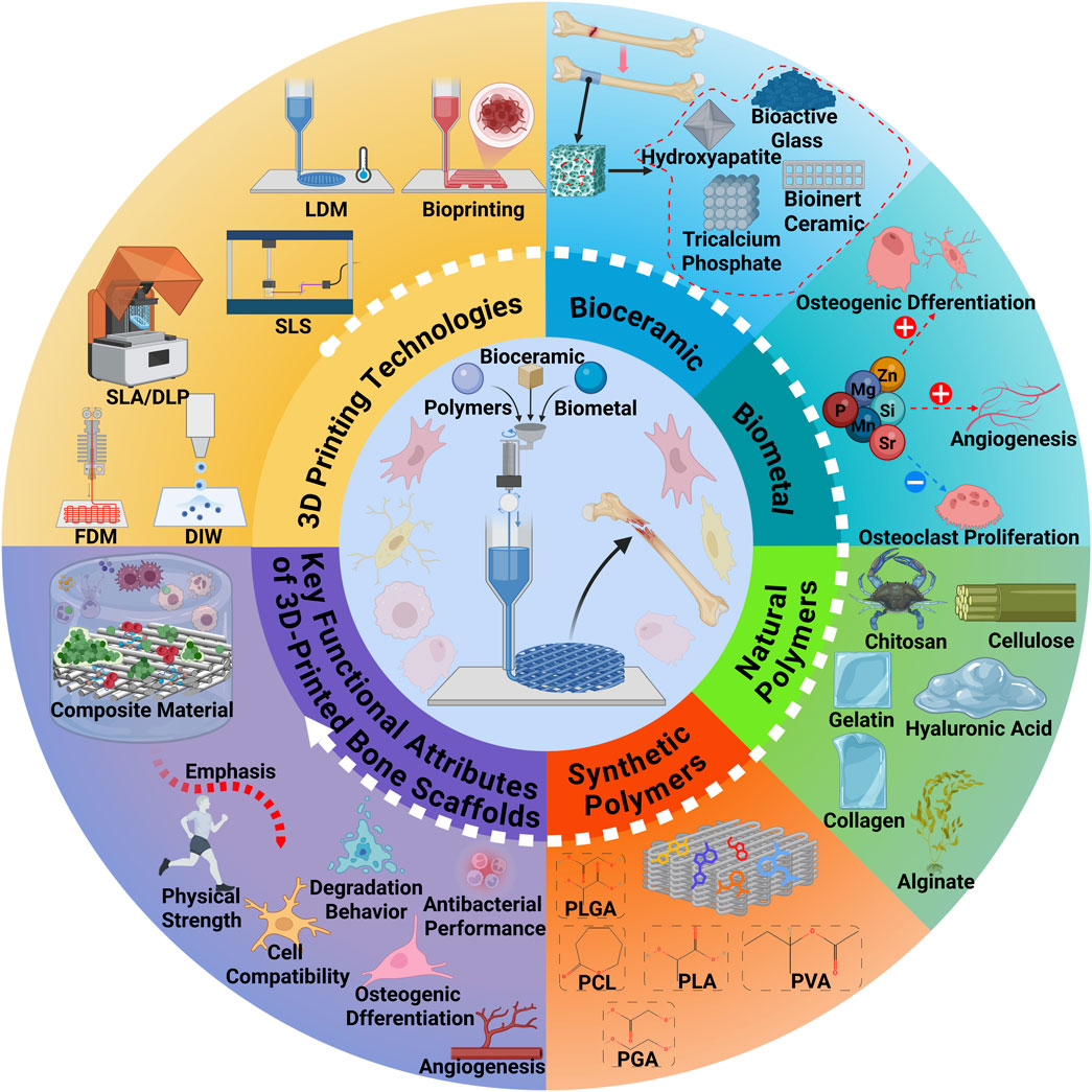 Biometals and their released ions play pivotal roles in bone regeneration by regulating osteogenesis, osteoclast activity, angiogenesis, and immune responses (Fan et al., 2024). They are commonly incorporated into 3D-printed scaffolds through alloying, surface modification, or ion-doped composites, providing tunable mechanical properties and bioactivity.