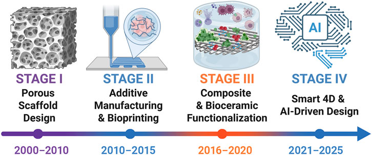 Figure 2. Timeline of 3D printing evolution in bone tissue engineering (2000–2025). Four stages are outlined: porous scaffold design (Hollister, 2005; Zadpoor and Malda, 2017), additive manufacturing and bioprinting (Do et al., 2015; Murphy and Atala, 2014), composite and bioceramic functionalization (Ma et al., 2018; Wang et al., 2020), and the emergence of smart 4D and AI-driven strategies (Wang et al., 2024; Yuan Y. et al., 2024). This figure was drawn using Biorender (https://www.biorender.com/).