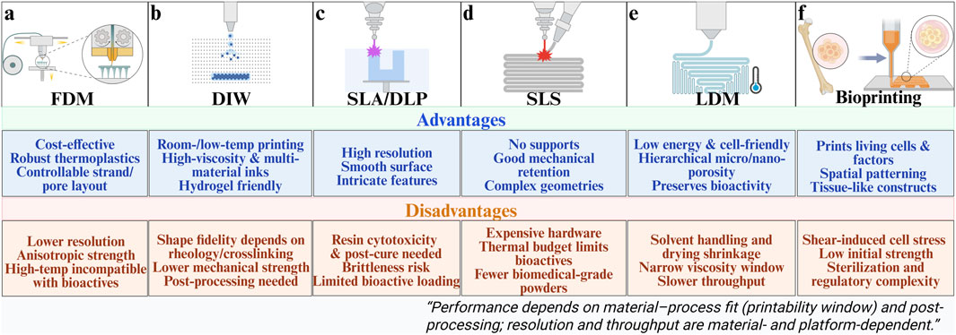Figure 3. Various 3D printing process schematics and their advantages and disadvantages. (a) Fused deposition modeling. (b) Direct ink writing. (c) Stereolithography/Digital light processing. (d) Selective laser sintering. (e) Low-temperature Deposition Manufacturing. (f) Bioprinting. This figure was drawn using Biorender. (https://www.biorender.com/).