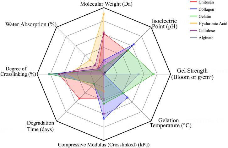 Figure 4. Radar chart depicting the fundamental properties of representative natural polymers used in bone tissue engineering. The relative scales of different parameters were normalized to ensure visual coherence in the chart.