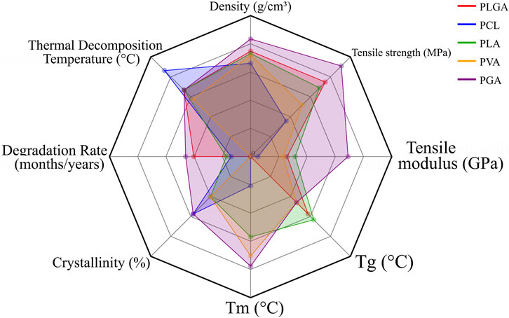 Figure 5. Radar chart illustrating the key properties of representative synthetic polymers applied in bone tissue engineering. To maintain consistency, parameter values were proportionally normalized across different indices for coherent visualization.