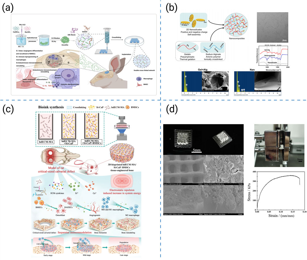 Figure 6. (a) 3D-printed hydrogel scaffolds reinforced with sepiolite nanofibers (Yang S. Y. et al., 2024). (b) Preparation and physical characterization of the nanocomposite hydrogels (Liu et al., 2020). (c) Construction and investigation schematic of the DLP 3D-bioprinted bdECM-MA/Si-CaP/BMSC tissue-engineered bone with exceptional mechanical strength (Liu et al., 2024). (d) Macrostructure and microstructure of the CDHA/PLGA bilayer scaffold in photographs and SEM images (Wu et al., 2021).