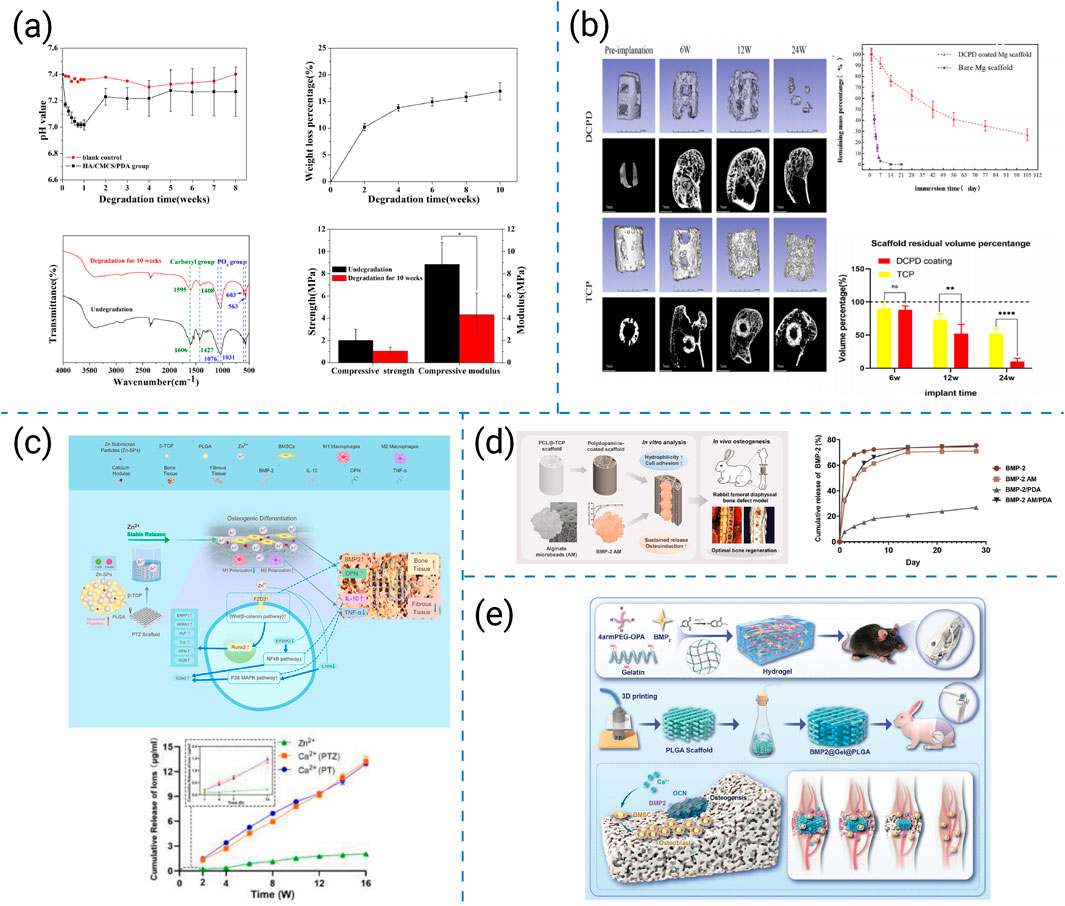 Figure 7. (a) Degradation performance of 3D-printed HA/CMCS/PDA porous bio-scaffolds (Chen et al., 2020). (b) Degradation performance of DCPD-coated 3D-printed porous magnesium scaffolds (Zhang et al., 2022). (c) Schematic illustration, potential molecular mechanisms, and cumulative release profiles of Ca2+ and Zn2+ from low-temperature 3D-printed Zn-SPs/PLGA/β-TCP scaffolds (Li X. et al., 2023). (d) Schematic illustration and release kinetics of 3D-printed PCL/β-TCP scaffolds coated with PDA and AM and loaded with BMP-2 (Lee et al., 2024). (e) 3D-printed porous PLGA composite scaffolds loaded with BMP-2/4armPEG-OPA/gelatin hydrogels (Dong et al., 2025).