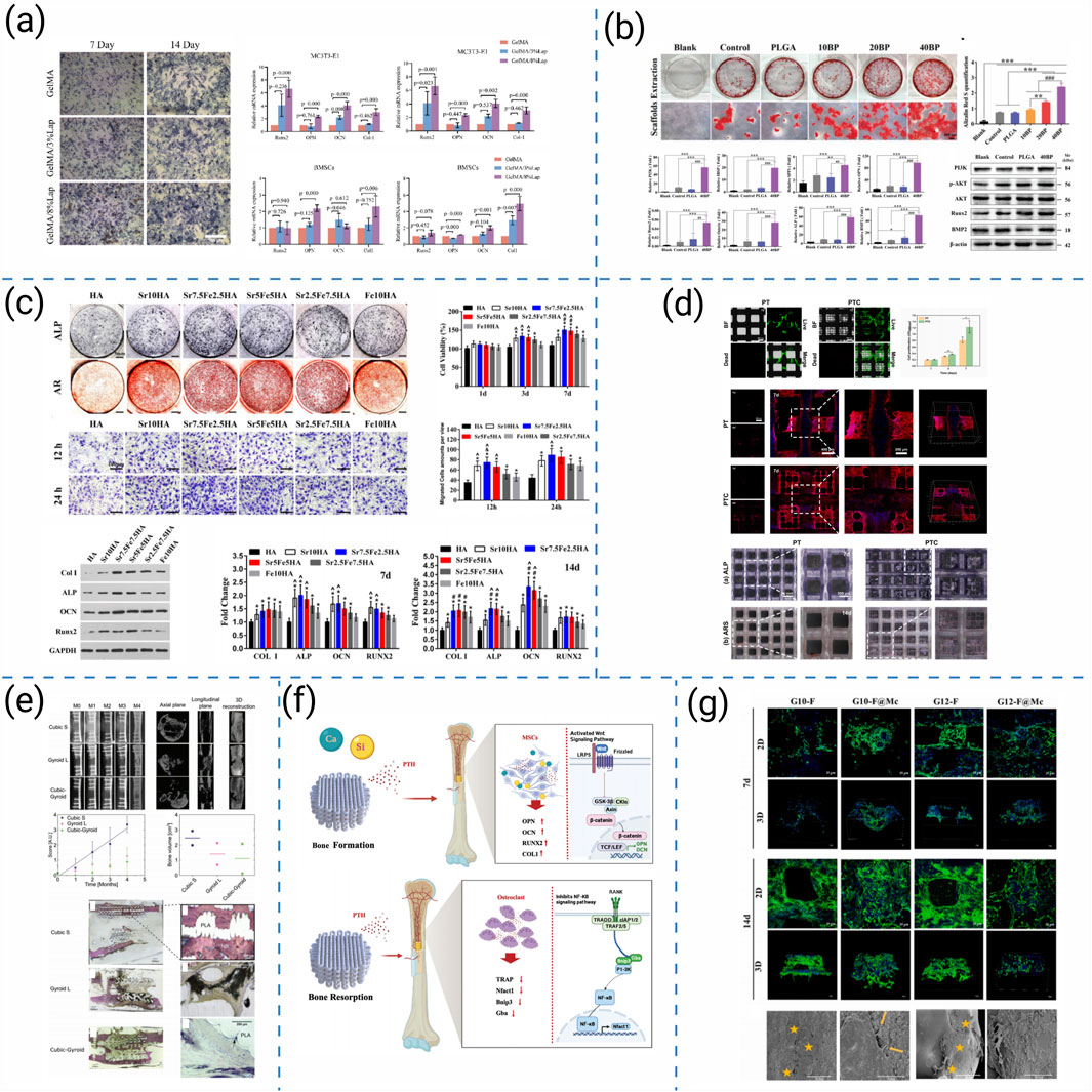 Figure 8. (a) Osteogenic differentiation assessment of 3D-printed hydrogel scaffolds (Zhou et al., 2024). (b) PLGA/BP scaffolds promote osteogenic differentiation and mineralization by activating PI3K-AKT signaling pathway (Long et al., 2023). (c) In vitro osteogenesis evaluations of MC3T3 cells stimulated by each group of scaffold extracts (Yang et al., 2021). (d) Cell viability and osteogenic differentiation on high-precision 3D-printed PCL/β-TCP hierarchical fiber scaffolds (Wang et al., 2021). (e) 3D-printed BMP2/PLA bio-coated scaffolds and their effects on bone regeneration (Garot et al., 2023). (f) Bidirectional regulation of bone homeostasis by 3D-printed PMBG/TCP/PTH scaffolds (Ren et al., 2023). (g) The proliferation and migration of MC3T3-E1 cells on 3D printed frameworks and composite scaffolds (Guo et al., 2023).