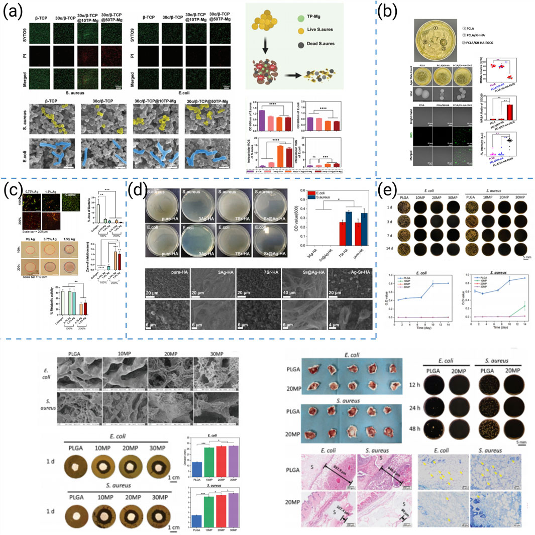 Figure 9. (a) In vitro antibacterial study of biomimetic α/β-TCP scaffolds loaded with TP-Mg nanoparticles fabricated by low-temperature 3D printing (Hu et al., 2024). (b) Antimicrobial activity of the coated scaffolds (Zhang et al., 2022). (c) Antibacterial properties of collagen-AgHA scaffolds in vitro (Genoud et al., 2025). (d) In vitro anti-bacterial effect of different scaffolds (Wang et al., 2025). (e) In vitro and in vivo antibacterial properties of low-temperature 3D-printed MgO2/PLGA porous nanoscaffolds (Li et al., 2024).