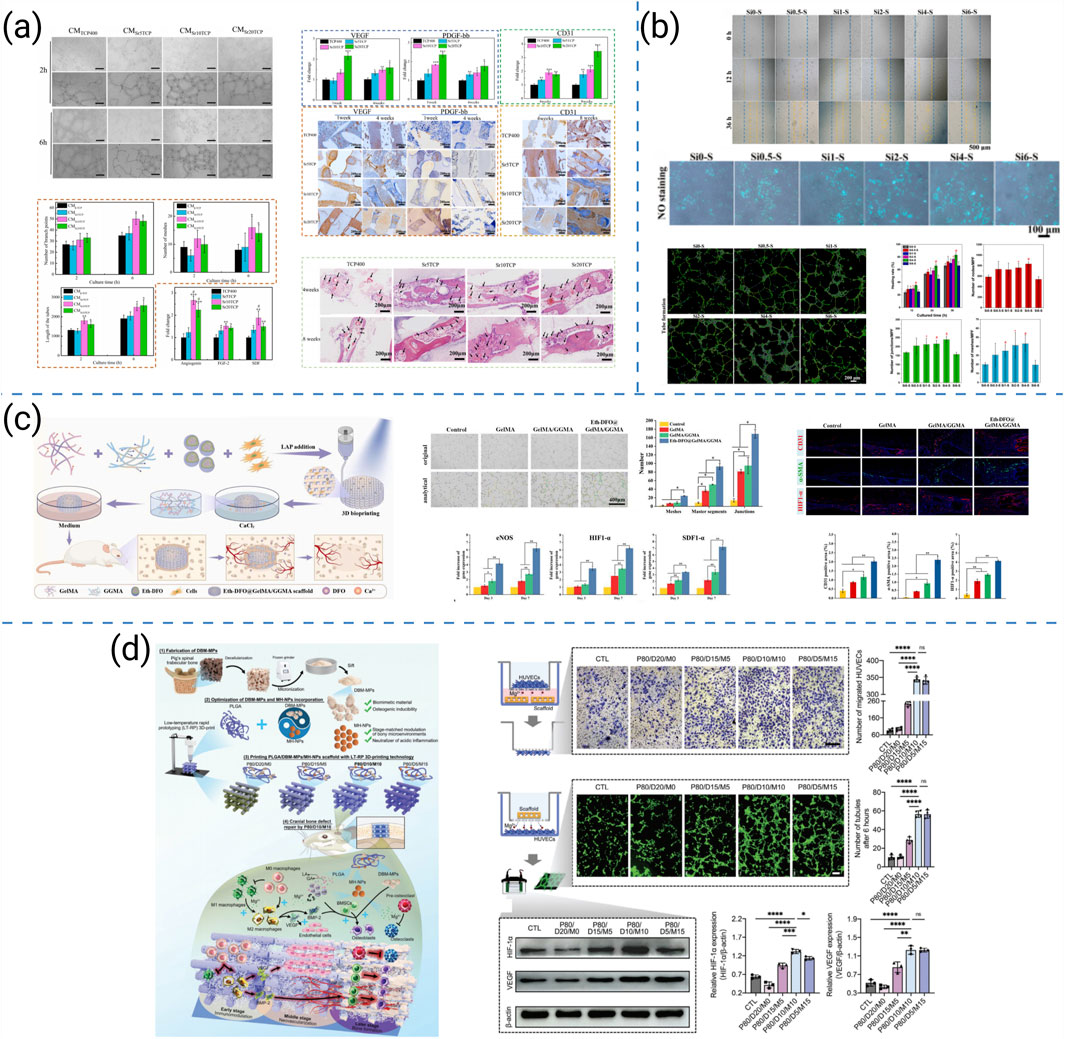 Figure 10. (a) Proangiogenic capacity of 3D-printed SrTCP highly interconnected porous scaffolds (Miao et al., 2023). (b) In vitro angiogenesis behaviors of HUVECs cultured in the extracts of Si-doped BCP scaffolds (Lu et al., 2024). (c) Schematic illustration for the construction process by 3D bioprinting Eth-DFO@GelMA/GGMA scaffold and its in vitro angiogenic capacity (Li et al., 2022). (d) Schematic illustration of a novel 3D-printed PLGA/DBM-MPs/MH-NPs scaffold for the enhancement of endogenous bone regeneration and in vitro angiogenic capacity of the four PLGA hybrid scaffolds (Yuan X. et al., 2024).