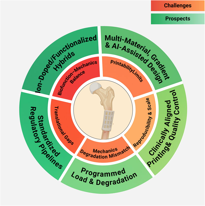 Although bioactive ceramics, functionalized polymers, and biodegradable metals offer promising cues for osteogenesis, angiogenesis, and immune regulation, challenges remain in achieving a balance between mechanical reliability, degradation control, and biological signaling. Future directions emphasize ion doping strategies (e.g., Sr, Mg, Zn) and advanced functionalization to optimize this balance.