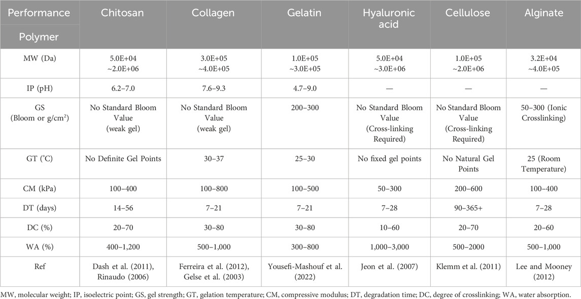 Natural polymers are widely applied in bone regeneration because of their excellent biocompatibility, biodegradability, and abundance (Asadi et al., 2020). They provide a favorable matrix for osteogenic adhesion, proliferation, and differentiation, yet their low mechanical strength restricts independent use in load-bearing sites (Islam et al., 2020; Yuan X. et al., 2024). Crosslinking and composite approaches are therefore commonly employed to enhance stiffness and to match degradation with tissue remodeling (Reddy et al., 2021).