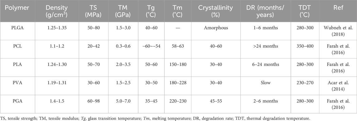 Polycaprolactone (PCL) demonstrates excellent biocompatibility without provoking inflammatory responses but shows low intrinsic osteogenic activity, which can be improved by surface modifications or ceramic incorporation (Daliri et al., 2024). PCL has favorable flexibility and printability (Afza et al., 2025), with a slow degradation rate (∼2–4 years) that allows long-term support and sustained release of loaded factors or cells (Hashemi et al., 2024; Li C. et al., 2023).