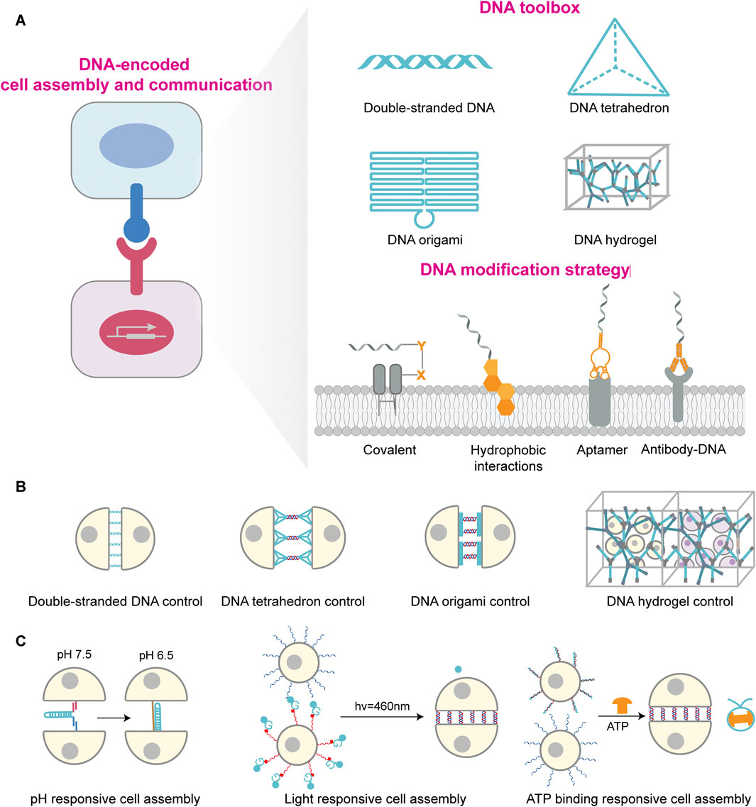 Figure 1. DNA-mediated cellular assembly and regulation: toolbox, modification strategies, and stimulus-responsive systems. (A) DNA-encoded cell assembly and communication schematic on the left. DNA toolbox library shown at top right, including double-stranded DNA, DNA tetrahedron, DNA origami and DNA hydrogel, which provides molecular regulatory tools for cellular interactions; The lower right side shows DNA modification strategies on cell membrane, including covalent linkage, hydrophobic insertion, aptamer binding and antibody recognition, to achieve stable anchoring of DNA molecules on cell membrane surface. (B) Different DNA structural units regulate cellular assembly patterns, including double-stranded DNA, DNA tetrahedron, DNA origami, and DNA hydrogel-regulated cellular assembly mechanisms. (C) Stimulus-responsive cellular assembly systems comprise pH, light, and ATP response units. These systems induce dynamic conformational changes or interactions in DNA through external stimuli, enabling controlled regulation and reversible switching of cellular assembly.