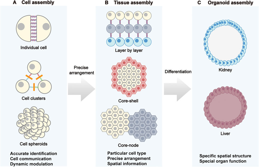 Morphogenesis in living systems is a complex and precise process driven by the spatiotemporally programmed self-assembly of cells into hierarchical architectures with defined structural and functional features (Lancaster and Knoblich, 2014). The morphology of tissues and organs, such as the chambered design of the heart, the lobular arrangement of the liver, and the intricate circuitry of neurons, is not merely a product of physical accumulation but reflects the ordered integration of specialized functional units (Zaret, 2002; Lancaster et al., 2013; Hofbauer et al., 2021). The ability to reconstruct such architectures in vitro, including multicellular clusters, tissues, and organoids, offers powerful tools for elucidating developmental principles and advancing applications in disease modeling, tissue regeneration, and drug screening (Escopete et al., 2025; Kim et al., 2025; Li M. Q. et al., 2025). Conventional tissue engineering techniques, such as hanging-drop (Wang S. H. et al., 2017), liquid-overlay (Martinez et al., 2015), spinner flasks and bioreactors (Jo et al., 2018), microfluidic devices (Park et al., 2019), and magnetic levitation (Jaganathan et al., 2014), enable the formation of cellular spheroids but often lack precision. These methods typically yield structures with heterogeneous size, composition, and poor reproducibility due to stochastic cell placement, thereby limiting their biomimetic fidelity and functionality (Lancaster et al., 2017; Hofer and Lutolf, 2021). Thus, a central challenge in the field is the engineering of robust and programmable control over cell–cell recognition and spatial organization.