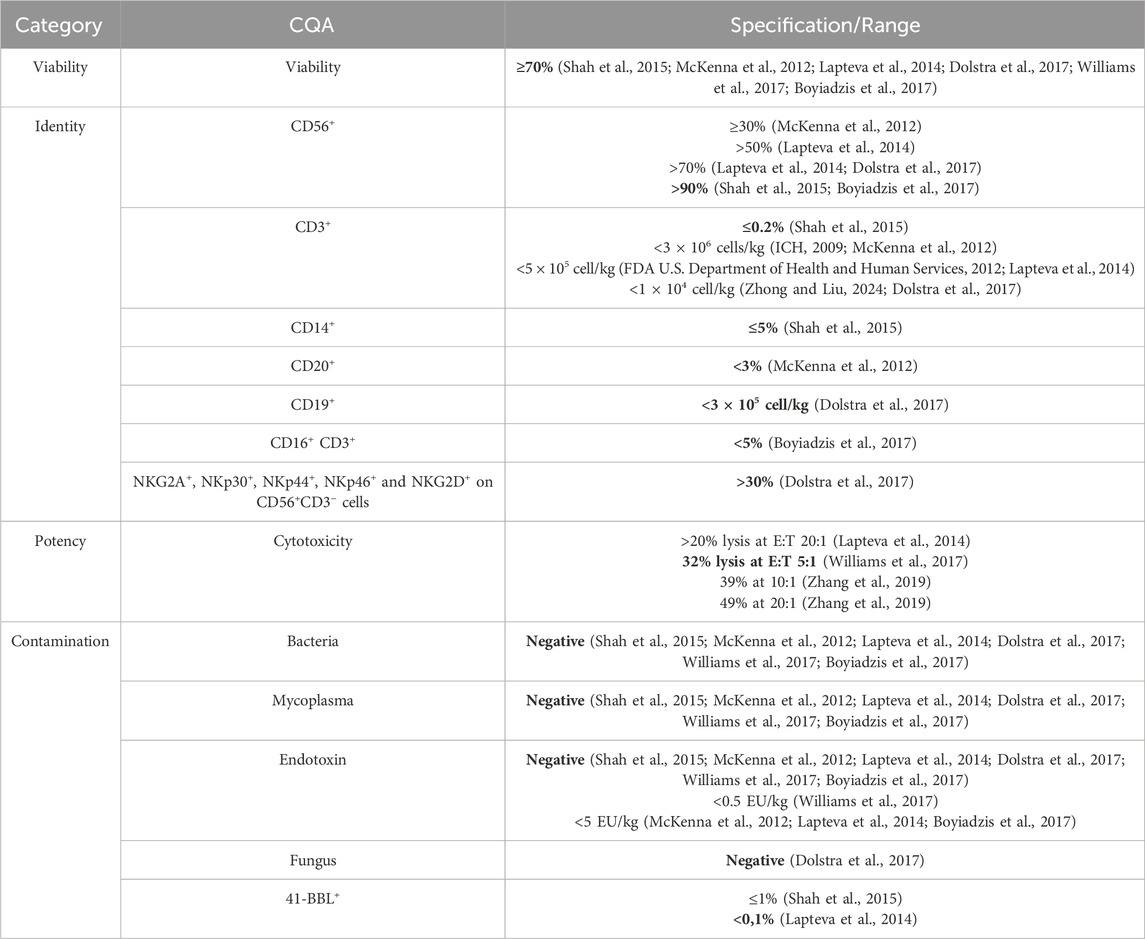 In all the clinical trials the accepted viability range for NK cells was uniformly set at ≥70%, highlighting its importance as a benchmark linked to clinical performance. Purity was defined by the presence of other cell types in the final NK cell product. Therefore, cell types were identified by cell surface markers of NK cells (CD56+), T cells (CD3+), B cells (CD19+, CD20+), monocytes (CD14+), and NK-like T cells (CD16+CD3+). Activation markers (NKG2D, NKp30, NKp44, NKp46) and inhibitory receptors (NKG2A) were reported to a variable extent, and NK cell purity criteria of the final product ranged from ≥30% to ≥90% (Shah et al., 2015; McKenna et al., 2012; Lapteva et al., 2014; Dolstra et al., 2017; Boyiadzis et al., 2017). T and B cell contaminants were strictly limited between ≤0.2% and <3% (Shah et al., 2015; McKenna et al., 2012; Lapteva et al., 2014; Dolstra et al., 2017). While most studies reported acceptable purity ranges in relative units (i.e., percentage of impurities within the final product), others presented only absolute cell counts. To improve cross-study comparability and regulatory alignment, CQAs should consistently be reported in relative units. Contamination standards were uniform, requiring sterility and strict endotoxin limits (negative detection to <5 EU/kg) (Shah et al., 2015; McKenna et al., 2012; Lapteva et al., 2014; Dolstra et al., 2017; Williams et al., 2017; Boyiadzis et al., 2017) as well as the absence of feeder cell residuals, such as the stimulant 41-BBL (Shah et al., 2015; Lapteva et al., 2014). Potency assay norms also varied, with tumor cell lysis values reaching up to 49% at an effector-to-target ratio acronym: (E:T) of 20:1 (Zhang et al., 2019). However, cross-study and cross-trial comparability remain challenging, as no harmonized assay protocols, such as consistent E:T ratios or standardized target cell types, have been employed, underscoring the urgent need for assay harmonization and clear definition of CQAs.