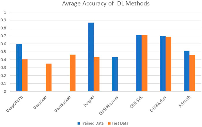 The performance of these tools is quantitatively assessed with two commonly used evaluation metrics, including accuracy and Spearman Correlation Coefficient (SCC) between predicted and real detected off-target activity. However, other evaluation metrics like Precision and Sensitivity (Eqs 2, 3) are used in some research as well. Spearman correlation seems to be a more reliable criterion. Most of these tools achieve promising accuracy in off-target prediction. Figures 5, 6 compare the off-target prediction efficacy of some popular tools. Due to their importance, we compare the accuracy of DL-based tools in separate diagram. The average accuracy of these tools is illustrated in the figures, as their accuracy differs among different genomes. For example, DeepCRISPR was the most accurate tool in the HEL cell line but performed poorly in the others. More details can be found in (Wang et al., 2019a; Zhu and LiangCRISPR-, 2019). Also, as a ML method, the accuracy differs between the train and test datasets. Unfortunately, for DeepCas9 and DeepSpCas9 (Chen et al., 2019), there is no report in their primary reference for the training dataset and the test dataset in CRISPRLearner (Bhagwat and Khuri, 2021). Accuracy, Precision, and Sensitivity are defined as follows, where TP, FP, TN, and FN represent true positive, false positive, true negative, and false negative, respectively.