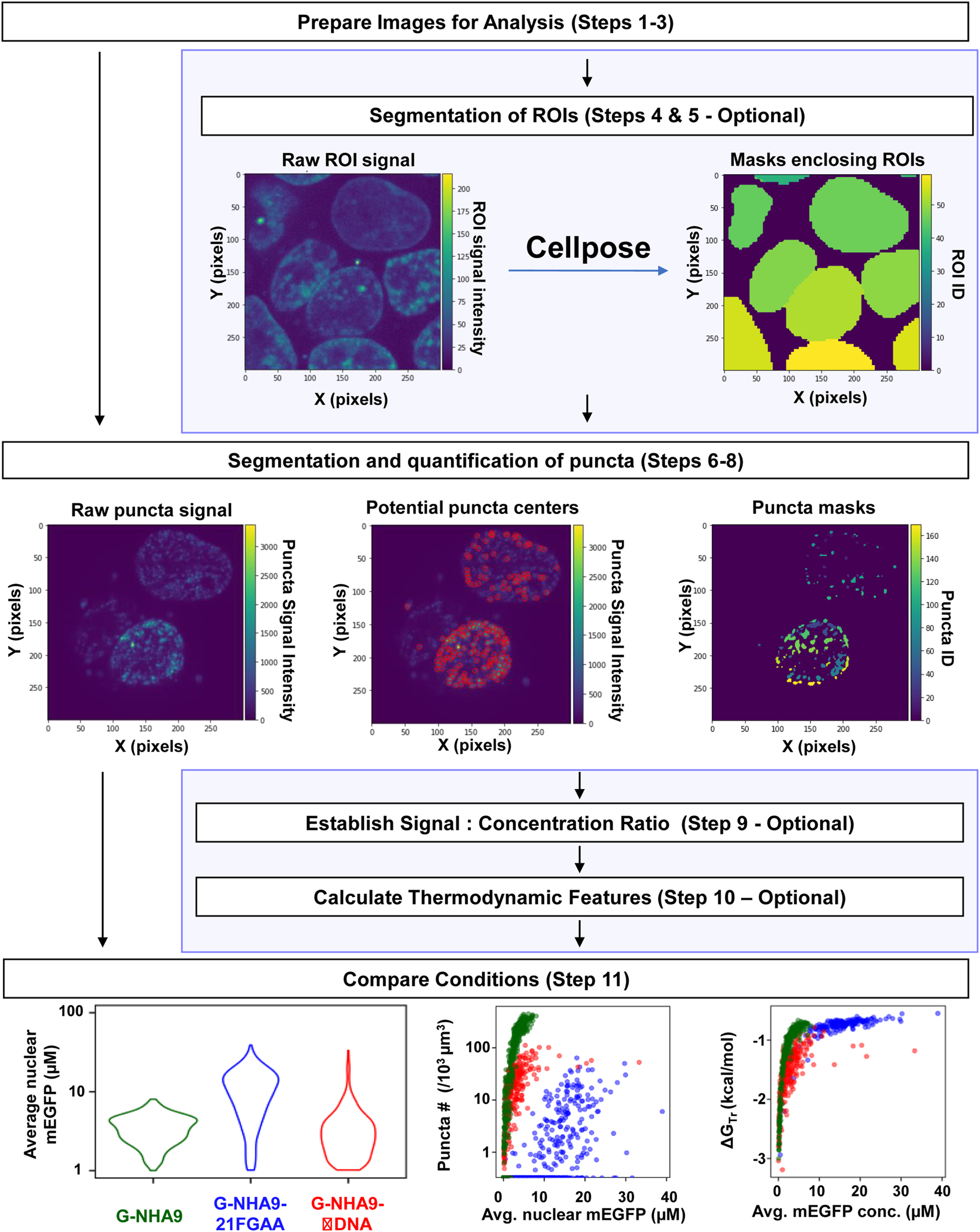 FIGURE 1. The Punctatools image analysis pipeline. After samples are prepared and image stacks are acquired (Steps 1–3), users are first given the option to segment regions of interest (ROIs) using Cellpose (Steps 4 and 5). Following this, puncta centers are identified from raw puncta signals, and puncta are segmented from the background (Steps 6–8). Users are given the option to establish a signal to concentration ratio (Step 9), which can be used when calculating thermodynamic features (Step 10) and making statistical comparisons (Step 11). Optional steps are highlighted by light-blue background. Average mEGFP concentrations shown on the graph x-axes are estimates derived from calibration and are subject to the limitations of this calibration as noted in the main text.