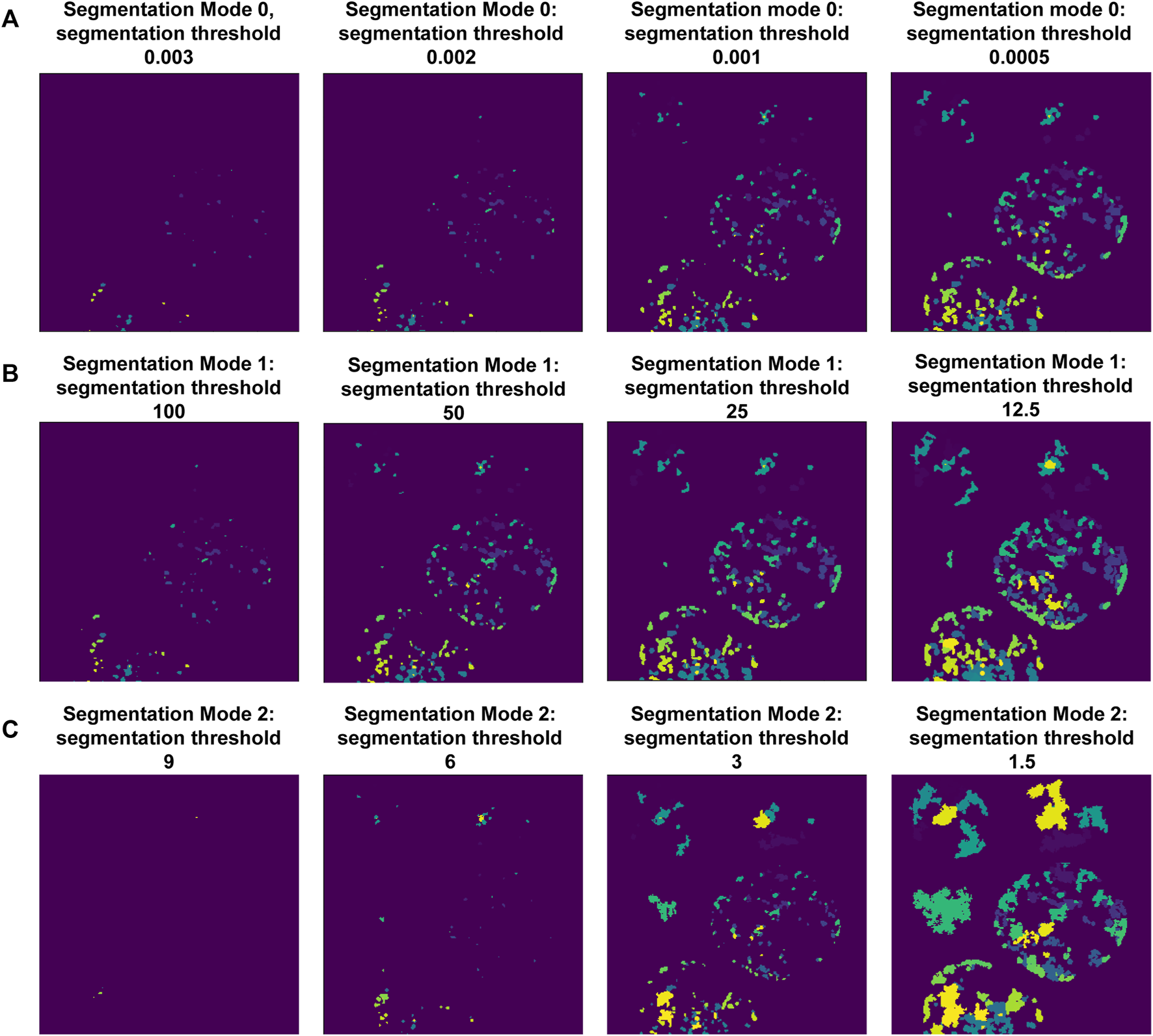 Following this, the notebook guides the user through adjusting the puncta segmentation parameters, beginning with the segmentation mode (Figure 3). If no ROIs have been segmented (Steps 4–5), set the segmentation mode to 0; this will analyze all puncta in LoG space using the same parameters according to the user defined segmentation threshold value. If ROIs have been segmented, you may choose mode 1 or 2; this will adjust the segmentation threshold depending on the background fluorescence in the ROIs. Mode 1 will segment puncta based on the LoG transformed image, while Mode 2 will segment puncta based on the original intensity values. This step may result in removal of some additional puncta detected after the previous step. Follow the guidelines in the notebook and Table 2, and inspect the output results to choose an adequate segmentation mode and threshold value for each channel of interest. Following this, additional filters such as the maximum allowed size of puncta and whether puncta outside of ROIs should be removed can be specified. The final parts of this setup protocol are to specify the names of input image channels and the output parameter file (if different from the input parameter file). Execute these parts of the notebook to save the adjusted parameter values, which will be used in the next step.