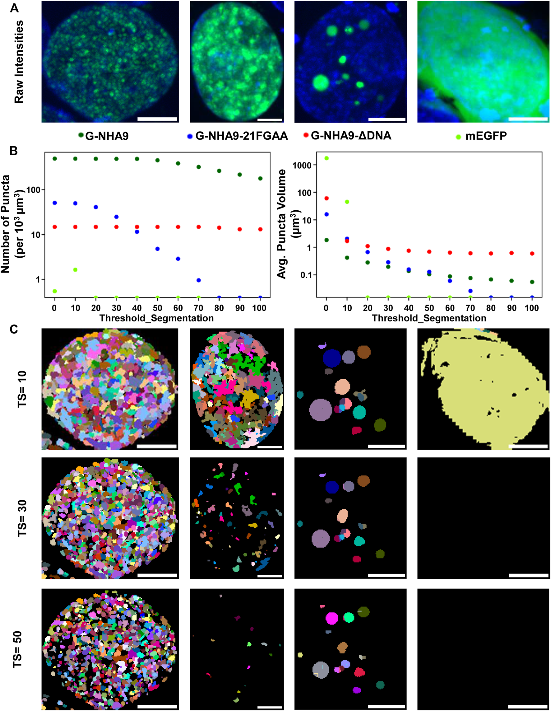FIGURE 4. Impact of the “threshold_segmentation” parameter on the number and volume of detected puncta. (A) Example cells expressing the G-NHA9 (left), G-NHA9-21FGAA (second from left), and G-NHA9-ΔDNA (second from right) constructs with different sizes of puncta; mEGFP (right) is the negative control. (B) Plots showing how extracted features such as average number of puncta per cell (left) and average volume of puncta per cell (right) change with differing segmentation parameters. (C) Puncta segmentation masks generated with different threshold_segmentation (TS) values. Scale bars show 5 µm. Puncta segmentation was performed using mode 1, default LoG parameters (num_sigma = 5, minsize_um = 0.2, maxsize_um = 2) and a threshold detection value of 0.002 to identify potential puncta centers. Images are shown as maximum intensity z-projections. Full z-stacks including 3D segmentation can be found in the supplemental files.